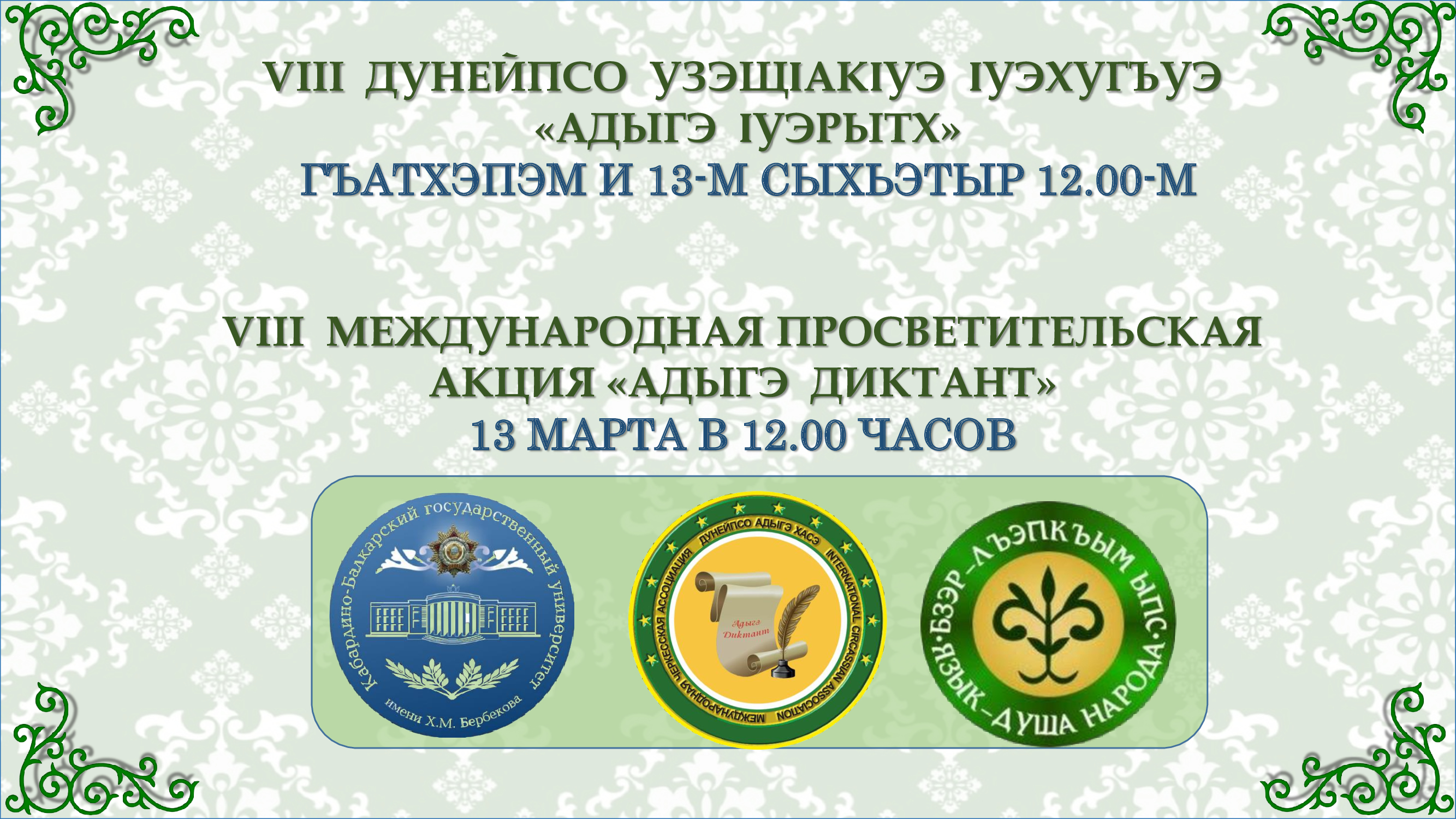 Международная Черкесская Ассоциация, Кабардино-Балкарский государственный университет, Адыгейский государственный университет приглашают принять участие в VIII Международной просветительской акции «Адыгэ диктант», которая будет проходить 13 марта 2026 года в 12.00 часов. Событие пройдет одновременно в офлайн и онлайн форматах.